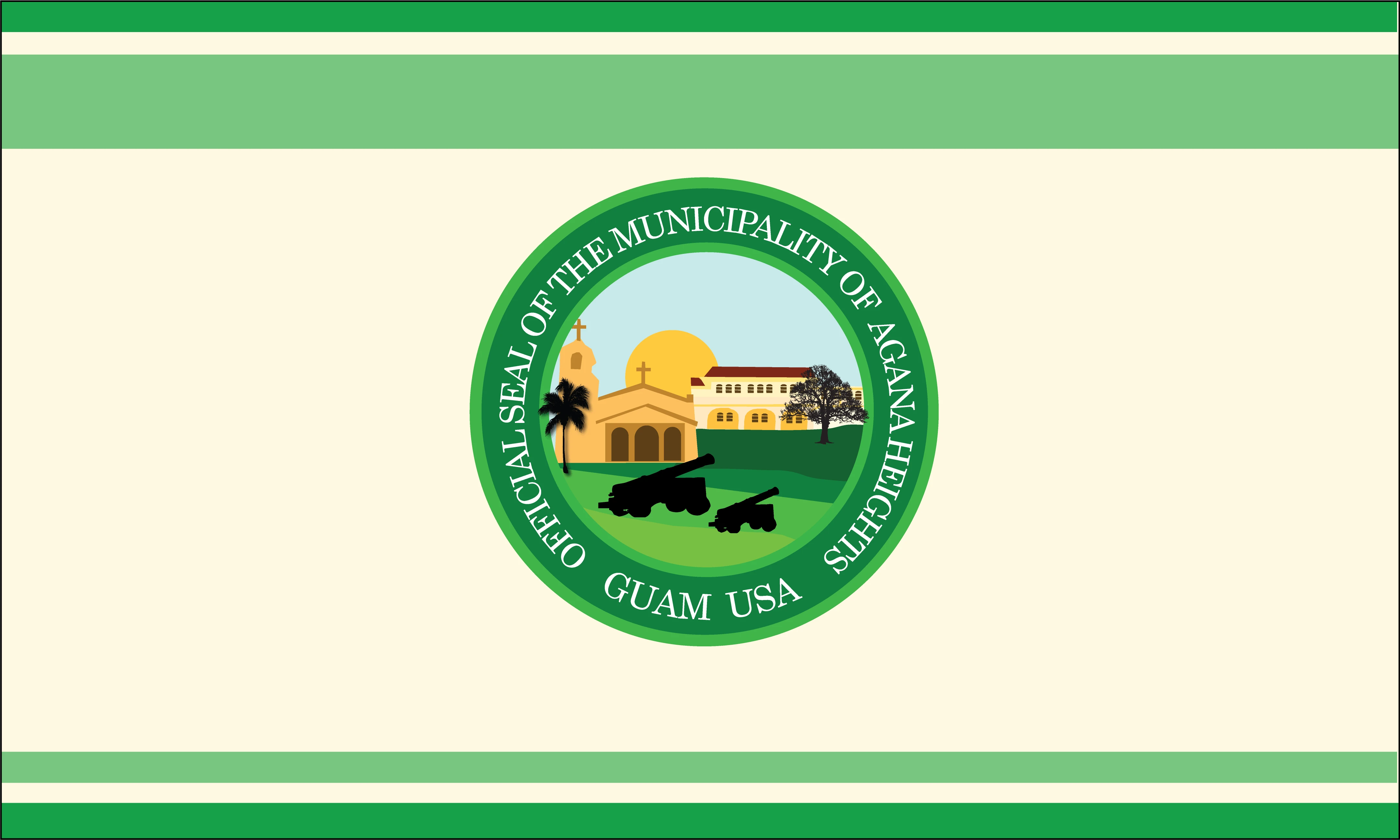 The flag of Agana Heights, Guam, United States, is multiple green lines on a very light yellow background with the village's seal in the center.