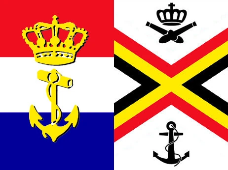 The flag of the Admiral Benelux, is split by the Dutch flag with the Royal Netherlands Navy emblem in the center, at the hoist, and the naval ensign of Belgium at the fly.