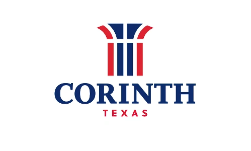 The flag of Corinth, Texas, is a white background with a stylized Corinthian column containing red and blue shapes, with the words "CORINTH" and "TEXAS", in a Serif font in blue and red.