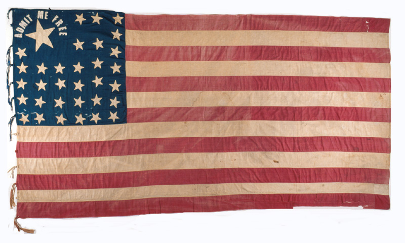 The "Admit Me Free" flag was flown by "free-staters", those who advocated the then U.S. territory Kansas being admitted to the Union as a "free" or non-slaveholding state during the late 1850's. It was frequently used by Republican Party Presidential candidates during the 1856 and 1860 elections to show support for a free Kansas, when Kansas' statehood was a major issue.