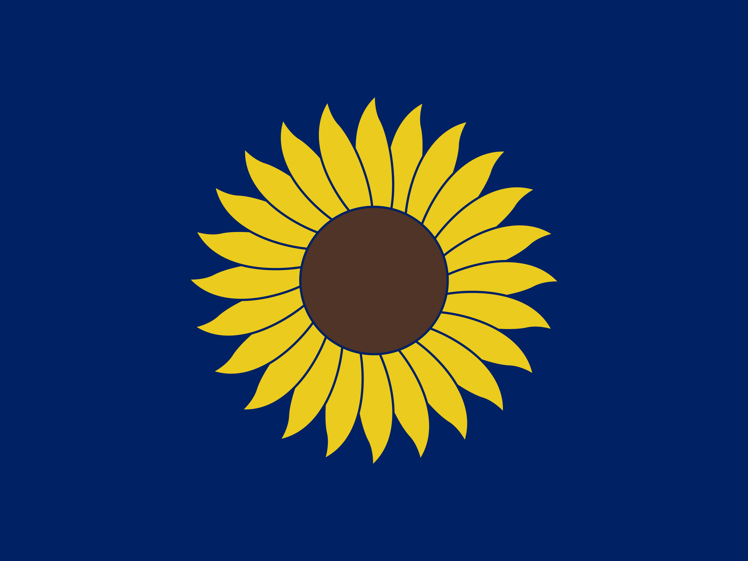 The flag of Kansas is blue with a stylized version of the state seal of Kansas just above the center of the flag. Above the seal is a stylized version of the Kansas state military crest, featuring a sunflower. Underneath the seal in large yellow lettering is the word "KANSAS".