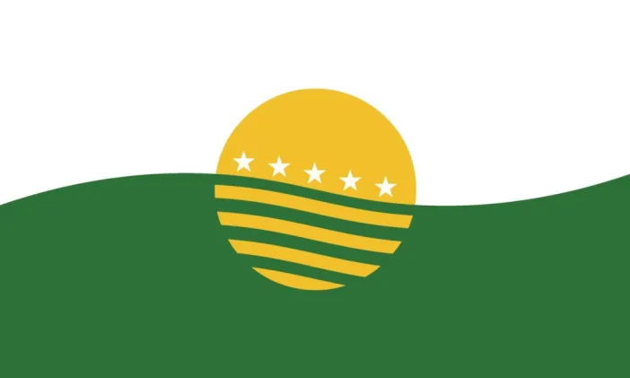 The flag was titled "Rolling Hills", and was divided between white with a half-yellow circle and five white stars, and green with the other half of the yellow circle divided into four stripes.