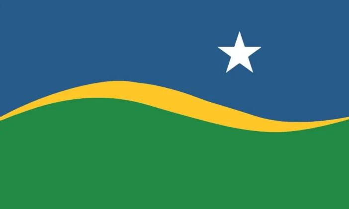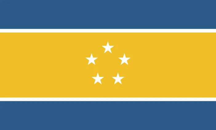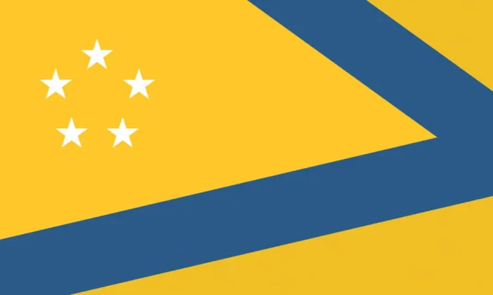 The flag was titled "Confluence", and also consists of a yellow background with two blue stripes forming a horizontal "V" shape, and five stars arranged in a ring pattern on the canton.