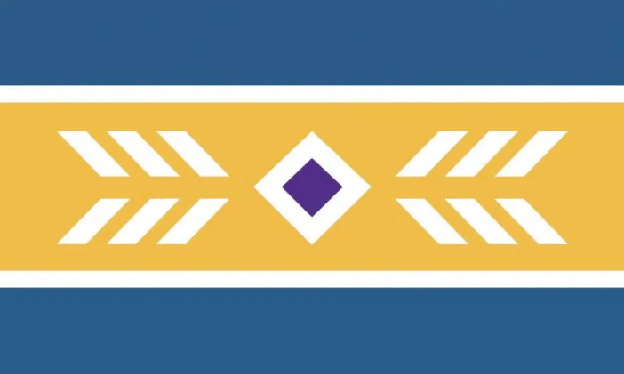 It was titled "Heritage", and has the same yellow and blue bars from the first flag design submission, with the white outlines becoming thicker. On the center is a purple diamond with a thick white outline, and twelve diagonal squares forming six chevrons on the left and right of the diamonds.