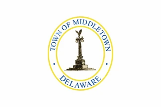 The flag of Middletown, Delaware, is a white background with the city's seal in the center. [1]