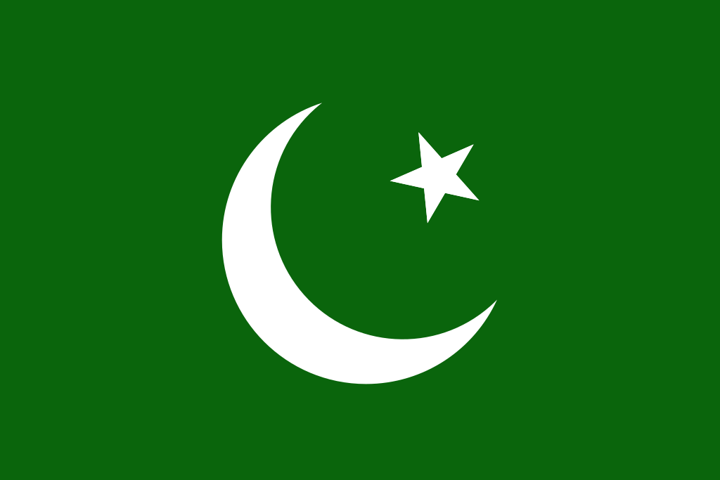 The flag of Pakistan is green with a white vertical white stripe on the hoist. In the center of the green area is a white crescent facing towards the upper fly corner of the flag. Halfway in between the crescent and the upper fly corner is a white five-pointed star, also facing towards the upper fly.