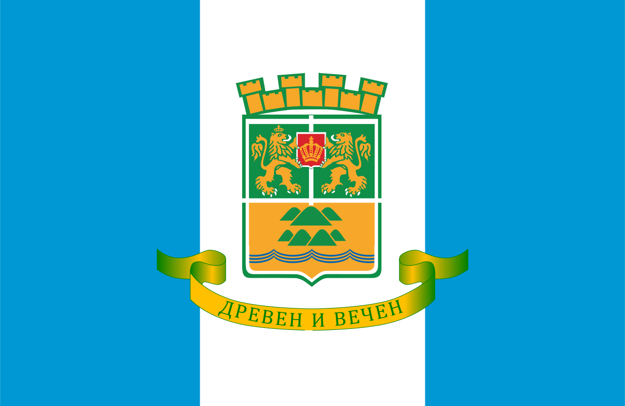 The flag of Plovdiv, a city in Bulgaria with a flag composed of an equal, vertical tricolour with sky blue bars at the left and right and a white stripe in the centre. In the middle of the flag is Plovdiv’s coat of arms. This flag shares the same flag as Plovdiv Province.