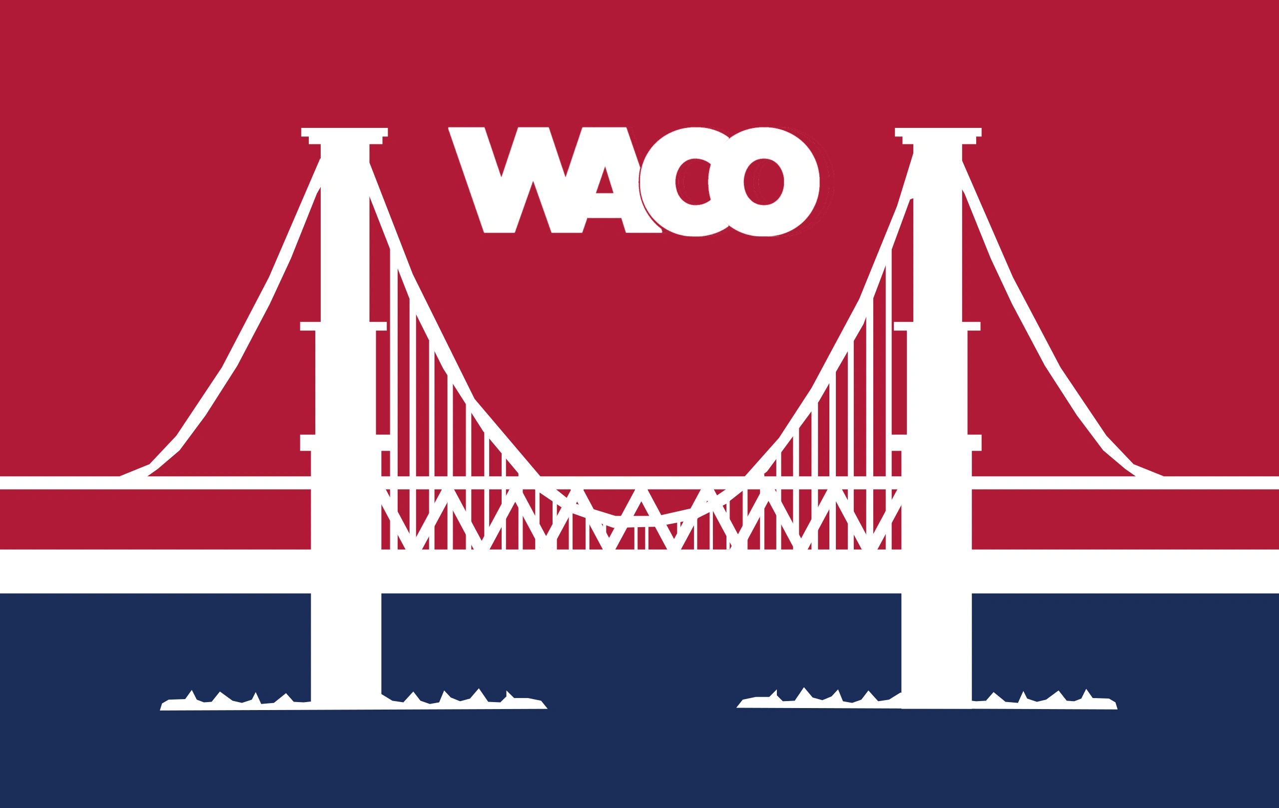 The former flag of Waco, Texas, featured a white silhouette of a bridge, over a red sky and blue waters, with the city's name at the top. It was adopted in 1985, and was designed by Gwen Stewart.[2] The flag was relinquished on February 20, 2024.